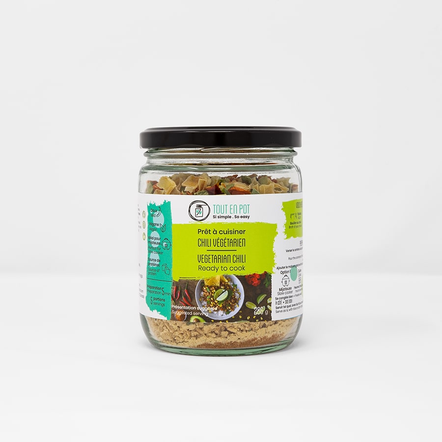 Ingrédients: Haricots blancs, fèves mungo, protéine de soja texturée, légumes déshydratés (carottes, oignons, pomme de terre, poireaux, poivrons verts et rouges, céleris, tomates, persil), épices, origan.